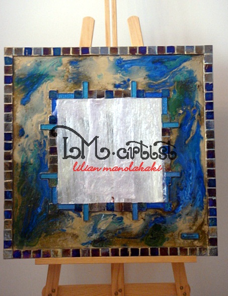 Καθρέφτης 60Χ60 με ψηφίδες murano αποχρώσεις δύσης ήλιου, σκόνη χρυσού, τεχνοτροπίας, κύματα χρυσού και μπλε