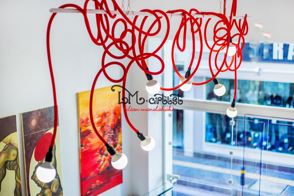 Φωτιστικό οροφής με χρωματιστά υφασμάτινα καλώδια, και στρογγυλές λάμπες led