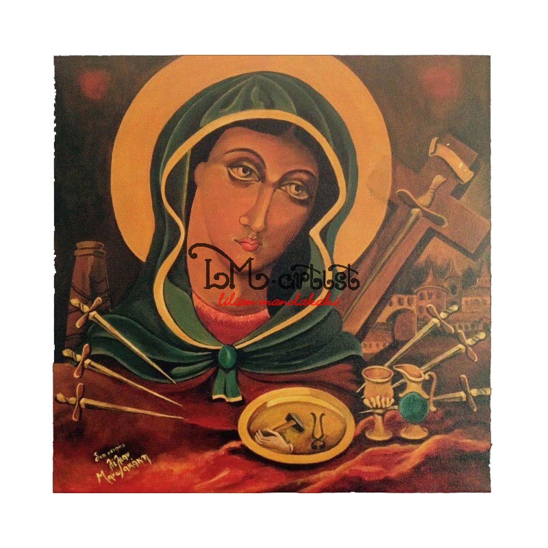 Παναγιά με τα επτά σπαθιά Σ'αυτήν την λίγο ασυνήθιστη εικόνα η Παναγία εμφανίζεται με την καρδιά διαπερασμένη από επτά σπαθιά. Η εικόνα τιμάται στις 13και26Αυγούστου Ακρυλικά σε ξύλο40X40 Καμβάς,ζωγραφισμένη στο χέρι
